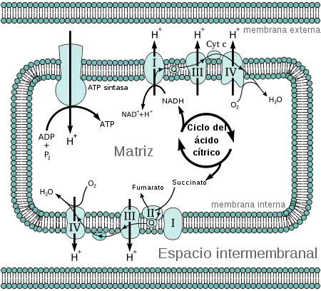 Ocurriendo en la mitocondria de las células, la energía química de NADH -producido por el ciclo de Krebs- es utilizada para construir un gradiente de iones de hidrógeno (protones) con una concentración mayor en las crestas mitocondriales y en menor concentración en la matriz mitocondrial. Este es el único paso de la fosforilación oxidativa que requiere de oxígeno: este es utilizado como aceptor de electrones, combinándose con electrones libres e iones de hidrógeno para formar agua.