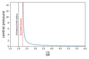 dónde es la constante de gravitación universal y es la velocidad de la luz . Esta desigualdad a menudo se denomina límite de Buchdahl . Históricamente, el límite también se ha llamado límite de Schwarzschild, ya que Karl Schwarzschild señaló por primera vez que existe en el caso especial de un fluido de densidad constante.[2] Sin embargo, esta terminología no debe confundirse con el radio de Schwarzschild, que es notablemente más pequeño que el radio en el límite de Buchdahl.