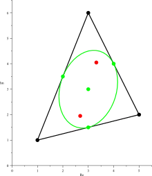 Por el teorema de Gauss-Lucas, la raíz de la doble derivada de un polinomio p"(z) debe ser el promedio de los dos focos de la elipse, que es el punto central de la elipse y a su vez el centroide del triángulo.