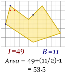 El teorema de Pick es una fórmula que relaciona el área de un polígono simple cuyos vértices tienen coordenadas enteras (los polígonos reticulares)[1] con el número de puntos en su interior y en su borde (frontera) que tengan también coordenadas enteras. Un punto cuyas coordenadas sean enteras se conoce como punto entero. El teorema de Pick establece que: