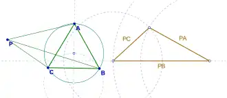 Considérese una rotación de 60° alrededor del punto B, de tal forma que la imagen de A es C y la imagen de P es P′. Entonces, , y . Por tanto, el triángulo PBP′ es equilátero y . Entonces, . Por tanto, el triángulo PCP′ tiene lados iguales a PA, PB y PC, y la demostración por construcción está completa (véase la ilustración).[1][2]