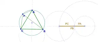 En caso de que P se encuentre en la circunferencia circunscrita al triángulo, entonces PA, PB y PC forman un triángulo degenerado, siendo el lado más largo igual a la suma de los otros dos. Esta observación también se conoce como teorema de Van Schooten.[1]