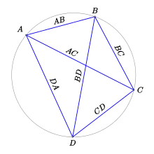El teorema de Ptolomeo es una relación en geometría euclidiana entre los cuatro lados y las dos diagonales de un cuadrilátero cíclico. El teorema recibe su nombre del astrónomo y matemático griego Claudio Ptolomeo.