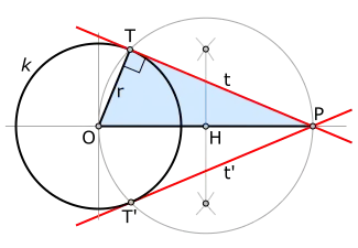Se supondrá que una tangente cualquiera t (por ahora desconocida) toca a la circunferencia k en un punto T (también desconocido por ahora). Se sabe por simetría que cualquier radio r de la circunferencia k es perpendicular a la tangente del punto T que dicho radio define en la misma, por lo que se concluye que ángulo OTP es necesariamente recto.