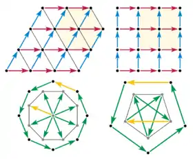 Una simetría rotacional en la dimensión 2 o 3 debe mover un punto de la red a una sucesión de otros puntos distintos de esa red pertenecientes al mismo plano, generando un polígono regular de puntos coplanares de la red. Ahora centraremos nuestra atención en el plano en que actúa la simetría.[3]