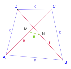 Para un cuadrilátero convexo con lados y ; diagonales y ; y siendo el segmento rectilíneo que conecta los puntos medios de las dos diagonales, se cumplen las siguientes ecuaciones: