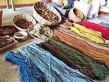 La principal tinta es la grana cochinilla extraída del nopal que tiñe en color rojo carmesí, el color amarillo se extrae de la cáscara de granada; el color café, de la cáscara de nuez; el azul se obtiene de la planta del índigo, también llamada añil.[6]