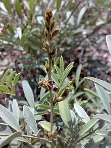 Los foliolos de la planta son obovadas -oblongos, en forma de cuña, de lados iguales, y de una textura sedosa. El nervio central suele plegarse longitudinalmente,[6] y se caracterizan por las venas transversales paralelas.[7] Los frutos ( legumbres ) son típicamente de 2.5 a 5.1 cm de largo y contienen seis o siete semillas de color marrón.[8][9] La planta muestra flores de color púrpura durante la temporada; se les describe como su mayor atractivo en el mes de enero. Por lo general crece a 45-50 cm de altura,[5] y puede crecer en las montañas con una altitud de más de 914 m.[10] Tanto diploides (22 cromosomas ) y tetraploide (44 cromosomas) cuyos citotipos se han reportado.[11]