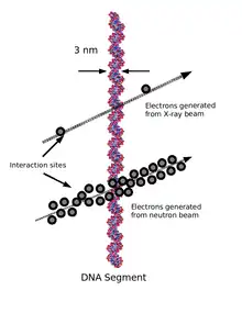 Cuando los rayos X de energía terapéutica (de 1 a 25 MeV) interactúan con las células del tejido humano, lo hacen principalmente mediante interacciones de Compton y producen electrones secundarios de energía relativamente alta. Estos electrones de alta energía depositan su energía aproximadamente en 1keV/µm.[3] En comparación, las partículas cargadas producidas en un punto de interacción con neutrones pueden entregar su energía con una intensidad de 30 a 80 keV/µm. La cantidad de energía depositada cuando las partículas atraviesan una sección de tejido se conoce como transferencia de energía lineal (TLE). Los rayos X producen radiación TLE baja y los neutrones producen radiación TLE alta.