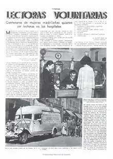La sección de biblioteca se encargaba de dar instrucciones para organizar las bibliotecas, hacer llegar la radio y la prensa al frente y a los hospitales, etc.[8]