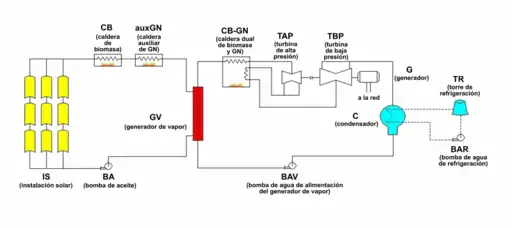 | Combustible | Biomasa, Energía solar, Gas natural | |