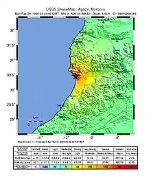 El terremoto de Agadir de 1960 tuvo lugar el 29 de febrero de 1960 en la ciudad marroquí de Agadir, situada en la costa atlántica. A pesar de su moderada magnitud de 5,8 en la escala de Richter, la intensidad máxima percibida fue de X (Extrema) en la escala de Mercalli.