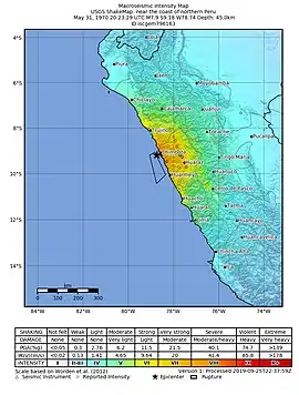 El terremoto de Áncash de 1970, también conocido localmente como terremoto del 70, fue un sismo que tuvo lugar el domingo 31 de mayo de 1970, a las 15:23, hora local.[2] Alcanzó una magnitud de 7.9 en la escala de magnitud de momento y una intensidad de grado IX (violento) en la escala de Mercalli.[1] Fue ampliamente sentido en toda la costa y sierra del departamento de Áncash y en regiones limítrofes del sur y norte del Perú. El sismo produjo desprendimiento de un casquete de hielo y rocas del nevado Huascarán, lo que resultó en un aluvión que sepultó la ciudad de Santo Domingo de Yungay, cobrando la vida de aproximadamente treinta mil personas.[3]