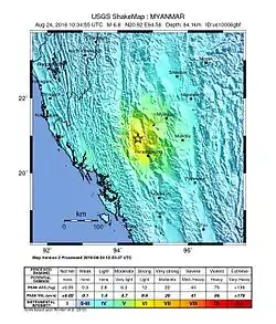 El terremoto de Birmania de agosto de 2016 fue un terremoto de magnitud 6.8 MW que golpeó a Birmania, a 25 kilómetros al oeste de Chauk el 24 de agosto de 2016 con una intensidad máxima de Mercalli VI (fuerte).[1] Golpeó a las 5:04 p. m. hora local (10:34 GMT) y tuvo su epicentro en una zona aislada. La profundidad estimada fue de 84,1 kilómetros. Las réplicas del terremoto se sintieron en Yangon, en las ciudades del este de Patna, Guwahati, y Calcuta en la India, en Bangkok en Tailandia y en Daca, la capital de Bangladés. Según los informes, varios templos de la antigua ciudad birmana de Bagan fueron dañados y cuatro personas murieron.[2][3]