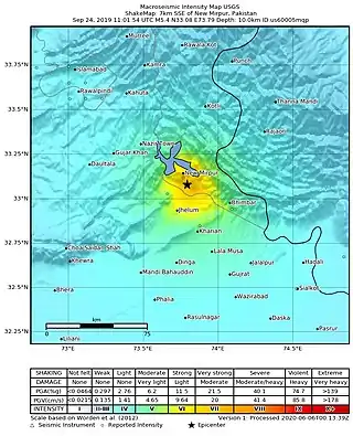El terremoto de Cachemira de 2019 golpeó a Cachemira con un epicentro en Azad Cachemira (la parte administrada por Pakistán del territorio en disputa de Cachemira) el 24 de septiembre a las 16:02 hora local (11:02 UTC).[1] Tuvo una magnitud de 5.6 Mw y una intensidad de fieltro máxima de VII (muy fuerte) en la escala de Mercalli Modificada. Hubo graves daños en el distrito de Mirpur, causando la muerte de 40 personas e hiriendo a otras 850. El epicentro del terremoto fue cerca de la ciudad de Mirpur, Pakistán. Los temblores se sintieron en la región de Cachemira, Punjab (Pakistán), Punjab (India), Uttarakhand y el norte de la India, incluida Nueva Delhi.[2]