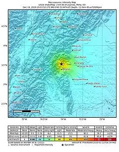 El terremoto de Mesetas de 2019 fue un sismo ocurrido a las 14:03 hora local (19:03 UTC) del día martes 24 de diciembre de 2019. Tuvo una magnitud de 6.0 en la escala sismológica de magnitud de momento, y se percibió en los departamentos colombianos de Santander, Norte de Santander, Boyacá, Cundinamarca, Antioquia, Caldas, Casanare, Quindío, Risaralda, Valle del Cauca, Tolima, Huila y Meta.[2]