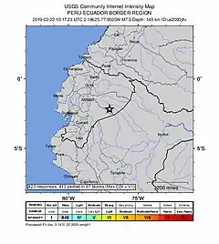 El Terremoto de Macas de 2019 fue un movimiento sísmico ocurrido el viernes 22 de febrero de 2019 a las 05:17 ECT (10:17 UTC). Tuvo una magnitud de 7.5 Mw, una intensidad de VII en la escala de Mercalli y una profundidad de 145 km.[1] Su epicentro se localizo en el Cantón Pastaza, en la Provincia de Pastaza, en la Amazonia ecuatoriana. Es el terremoto más fuerte que ocurrió en Ecuador desde el Terremoto de Abril de 2016, el sismo llegó a sentirse en Perú y en Colombia.[2][3]