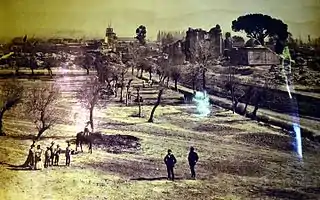![]() Ruinas en la Plaza Pedro del Castillo de la ciudad de Mendoza luego del terremoto de 1861. | ||