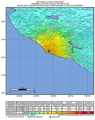 El terremoto de Michoacán de 2022 ocurrió a las 13:05:07, hora local (UTC-5) del lunes, 19 de septiembre de 2022, localizado en la Brecha sísmica de Michoacán con epicentro a 63 km al sur de Coalcomán de Vázquez Pallares[3] y una magnitud de momento de 7,6 (USGS); 7,7 (SSN), e intensidad máxima de Mercalli de VIII (severo).