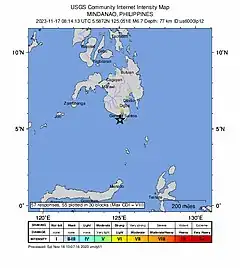 El terremoto de Mindanao de 2023 fue un movimiento sísmico ocurrido el 17 de noviembre de 2023 a las 16:14 hora local (08:20 UTC). Tuvo una profundidad de 78 km y una magnitud de 6.7 Mw.[1]Tuvo una intensidad de VIII (Severo) en la escala de Mercalli. Su epicentro fue en la provincia de Dávao Occidental. 11 personas resultaron muertas y 776 resultaron heridas.