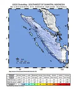 El terremoto de Sumatra de 2016 fue un terremoto de magnitud 7,8 MW que sacudió el 2 de marzo de 2016 al océano Índico, a unos 800 kilómetros al suroeste de Sumatra, en Indonesia.[1] Las alertas de tsunami fueron emitidas por Indonesia y Australia,[2] pero fueron retirados dos horas más tarde.[3] Heronimus Guru, jefe adjunto de la Agencia Nacional de Meteorología de operaciones, inicialmente declaró que "hay algunos que han muerto",[4] sin citar una cifra oficial de muertos. Sin embargo, ahora se sabe que no hubo muertes directamente relacionadas con el terremoto.[5]