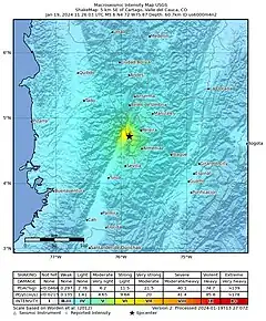 El Terremoto del Eje Cafetero de 2024 fue un movimiento sísmico de una magnitud de 5.6 MW ocurrido el día viernes 19 de enero de 2024 a las 06:26 UTC-5.[1]Tuvo una profundidad de 52 km y una intensidad en la escala de Mercalli de VII.[2]Su epicentro se localizó en el Norte del Departamento de Valle del Cauca en el municipio de Ansermanuevo, a 5 km del municipio de Cartago.[3]