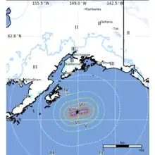 Inicialmente se estimó como un evento de magnitud 8.2, pero luego fue degradado por el Servicio Geológico de los Estados Unidos.[2] El terremoto se sintió en la mayor parte del sur de Alaska, incluidas las principales ciudades de Anchorage y Fairbanks, y partes de la vecina Columbia Británica.[3][4]