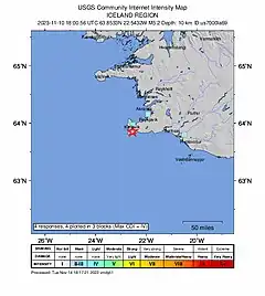Una serie de intensos terremotos en la región Suðurnes, Islandia, comenzó el 24 de octubre de 2023 debido a una intrusión magmática debajo del área.[1] La frecuencia y la intensidad de los terremotos aumentaron dramáticamente el 10 de noviembre, con 20.000 temblores registrados hasta el 10 de noviembre, superando el más grande la magnitud 5,1. Se ordenó la evacuación en la localidad de Grindavík, situada cerca de la zona de actividad sísmica.[1]