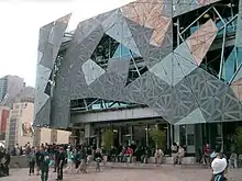 El Federation Square, un complejo de edificios en Melbourne, (Australia), utiliza como motivo decorativo de las fachadas el teselado de molinillo. En el proyecto, los patrones de enlosado, prefabricados en un taller, quedaban enmarcados en las fachadas. Estaban basados en elementos triangulares individuales, compuestos por piezas de cinc, cinc perforado, arenisca o vidrio, unidos a otras piezas similares sobre un marco de aluminio, para formar un "tablero". Cinco de estos tableros se fijaban a un marco de acero galvanizado, formando un "mega-tablero", que a su vez era fijado a los marcos de soporte de las fachadas. La orientación rotacional de las piezas da a las fachadas un aspecto aleatorio, una calidad de composición incierta, incluso aunque el proceso de su construcción está basado en la prefabricación y la repetición. El mismo sistema de teselado se usó en el desarrollo del marco estructural tridimensional y del vidriado del "Atrio" de Federaction Square.