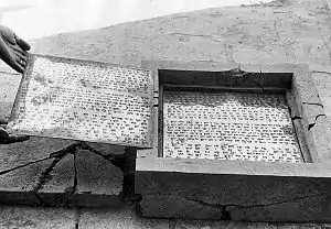 Las tablillas de oro y plata recuperadas de las cajas de piedra contenían una inscripción trilingüe de Darío en persa antiguo, elamita y acadio, que describe su Imperio en términos geográficos amplios, y que se conoce como la inscripción DPh:[1]