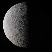 ![]() Fotografía de Tetis tomada por la Voyager 2 el 26 de agosto de 1981 a 282 000 km de distancia. | ||