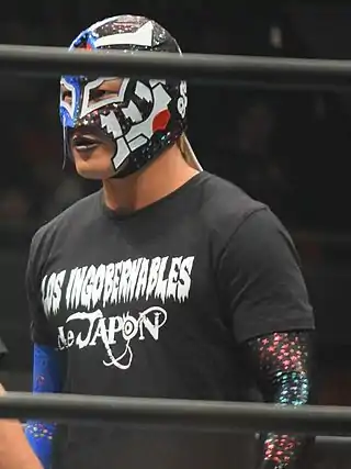 - Insurgentes[5] (Electric chair (Takahashi) / Diving double knee facebreaker (Bushi) combination)[6]