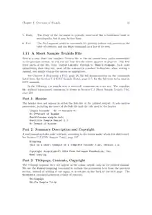Texinfo permite estructurar un documento como un libro con capítulos, secciones, referencias cruzadas e índices. La mayor parte del texto fuente es texto plano, pero técnicamente es texto formateado marcado por comandos que empiezan con "@". Una muestra parcial de un fichero fuente sería: