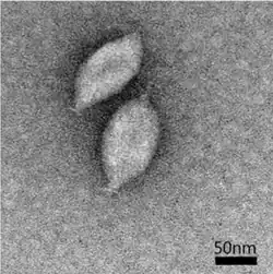 ![]() Dos viriones del Nitrosopumilus spindle-shaped virus 1, especie Nitmarvirus NSV1 | ||