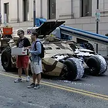 Las fotos de la producción del rodaje en Pittsburgh mostraban un segundo chasis del Acróbata, indicando que habría un nuevo Batimóvil en la película después de la destrucción del primero en The Dark Knight.[115] Más fotos del set revelaron un «nuevo vehículo» transportado al túnel Wabash, lo que provocó especulaciones en cuanto a su naturaleza.[116] En junio de 2011, Autoblog confirmó la presencia del nuevo Lamborghini en el set de filmación.[117]