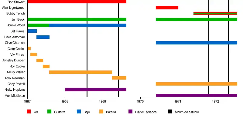 ![]() The Jeff Beck Group en 1967. De izquierda a derecha: Rod Stewart, Ronnie Wood, Micky Waller y Jeff Beck. | ||