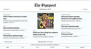 ![]() Portada de The Signpost del 24 de febrero del 2016 | ||