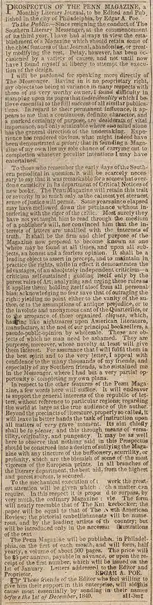 - En el inglés original: «PROSPECTUS OF THE PENN MAGAZINE, a Monthly Literary Journal, to be Edited and Published in the city of Philadelphia, by Edgar A. Poe».