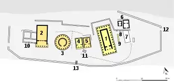 1. Templo de Atenea Pronea 2. Nuevo templo (de Atenea Pronea?) 3. Tholos 4. Tesoro de Masalia 5. Tesoro Dórico 6. Témenos de los héroes 7. Altar de Atenea Pronea 8. Altar de Higía e Ilitía 9. Altar arcaico no identificado 10. Edificio no identificado (para sacerdotes?) 11. Base para la estatua del emperador Adriano? 12. Entrada este 13. Entrada sur
