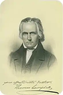 - Poco después de que su primogénito, Alexander Campbell, fuera ordenado en 1812, Thomas comenzó a apoyar a Alexander. Thomas eran generalmente menos radical que su hijo y su influencia supuso la estabilización del movimiento.