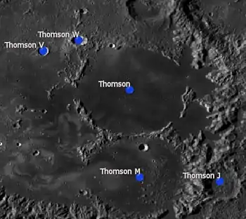 Thomson es un cráter de impacto que se encuentra dentro del Mare Ingenii, en la cara oculta de la Luna. Justo al noreste se halla la inusual formación de cráteres fusionados de Van de Graaff. En el borde noroeste del mar lunar se ubica O'Day, y al sur-suroeste yace Obruchev, en la orilla sur del Mare Ingenii.