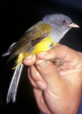 ![]() Tiaris olivaceus | Tiaris Swainson, 1827[nota 14][3][16][22][23] |