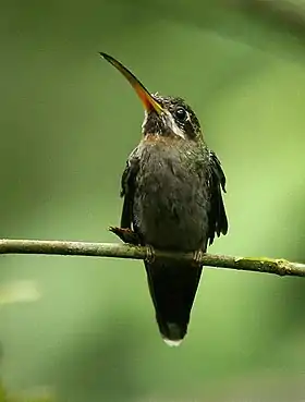 ![]() Ermitaño barbudo colibandeado (Threnetes ruckeri) en Río Silanche, Provincia de Santo Domingo de los Tsáchilas, Ecuador. | ||