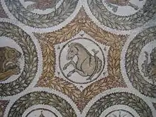 El mosaico que se denomina Teseo y el Minotauro se puede datar a finales del siglo III. En este mosaico se representa la batalla final donde Teseo se dispone a cortar la cabeza al Minotauro.[31] Este mosaico se complementa con escenas de monstruos marinos y naturaleza muerta.[32] También en varios mosaicos podemos encontrar escenas de vida cotidiana, como escenas de caza a caballo con perros.[33]