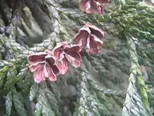 ![]() Follaje y conos de Thuja standishii lado superior a la izquierdxa, lado inferior a la derecha | ||