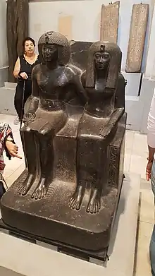 ![]() Estatua sedente de Tutmosis IV con su madre Tiaa. Museo Egipcio de El Cairo. | ||