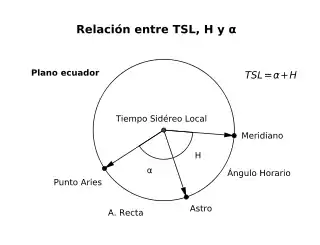 El tiempo sidéreo local (Tsl o ) o la hora sidérea local es el ángulo horario que forma el punto Aries con el meridiano del observador. El tiempo sidéreo local es la ascensión recta de un astro más el ángulo horario de dicho astro:[2]