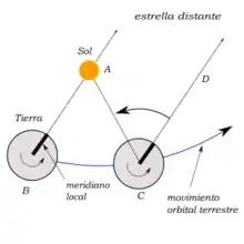 Como se muestra en la FIGURA 2, el tiempo transcurrido entre culminaciones sucesivas no es el mismo para el Sol que para las estrellas distantes. Al trasladarse la Tierra de B a C la estrella culmina de nuevo pero el Sol no, y se dice que retrasa el ángulo DCA que es lo que le falta para repetir su culminación. El tiempo correspondiente al arco BC es un tiempo sidéreo.