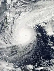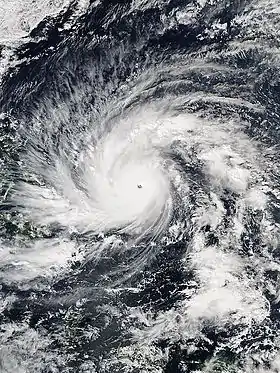 ![]() El supertifón Hagupit en su máximo pico de intensidad el 4 de diciembre de 2014, al este de las Filipinas. | ||