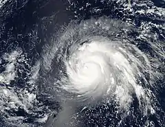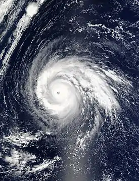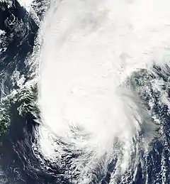 ![]() Vista en la imagen satélite, el tifón Higos alcanzó su máxima intensidad como un supertifón de categoría 4 en la escala de huracanes de Saffir Simpson (EHSS), localizado cerca de Japón el 30 de septiembre de 2002 | ||